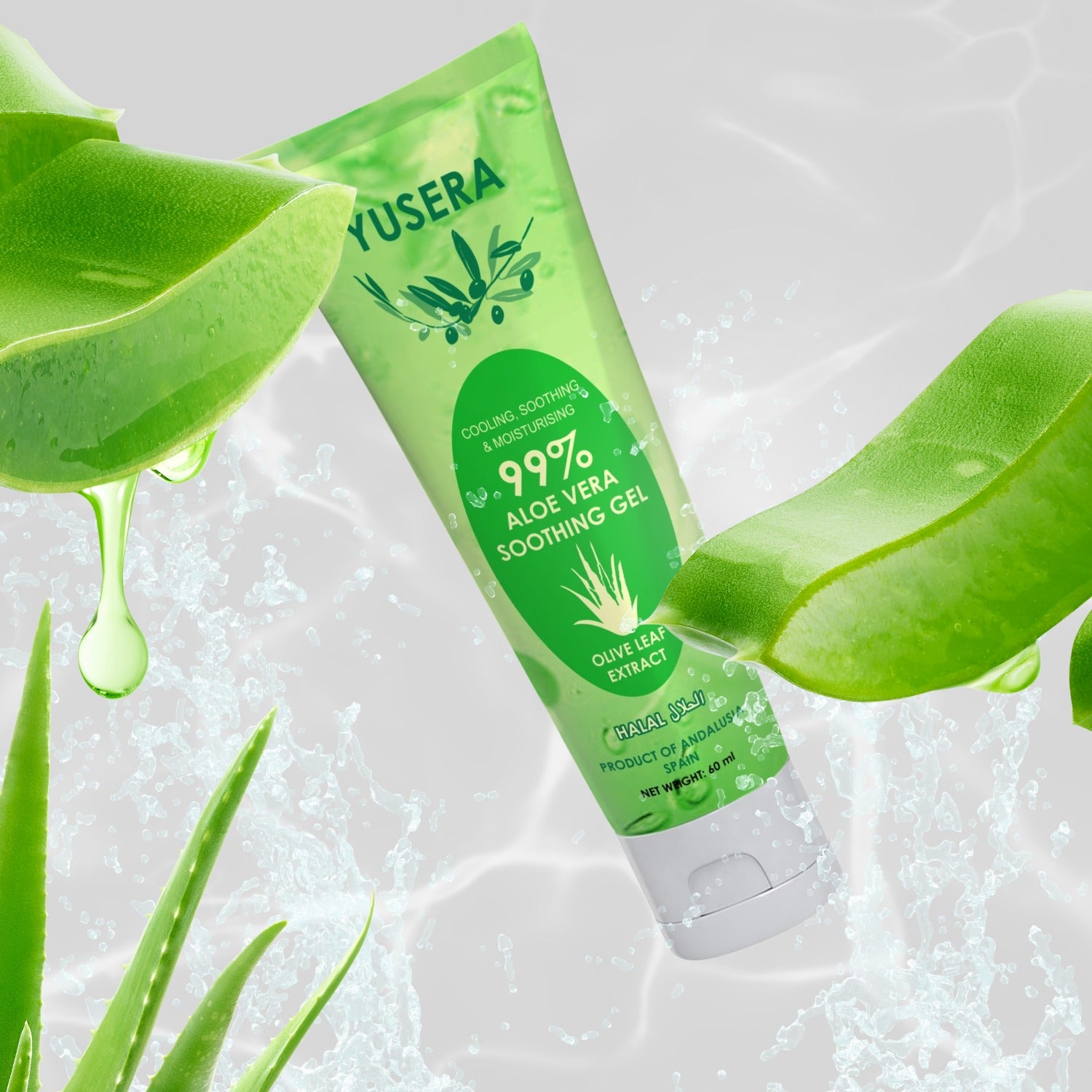 YUSERA Cooling , Soothing & Moisturizing 99% Aloe Vera Soothing Gel 60ml With Olive Leaf Extract .