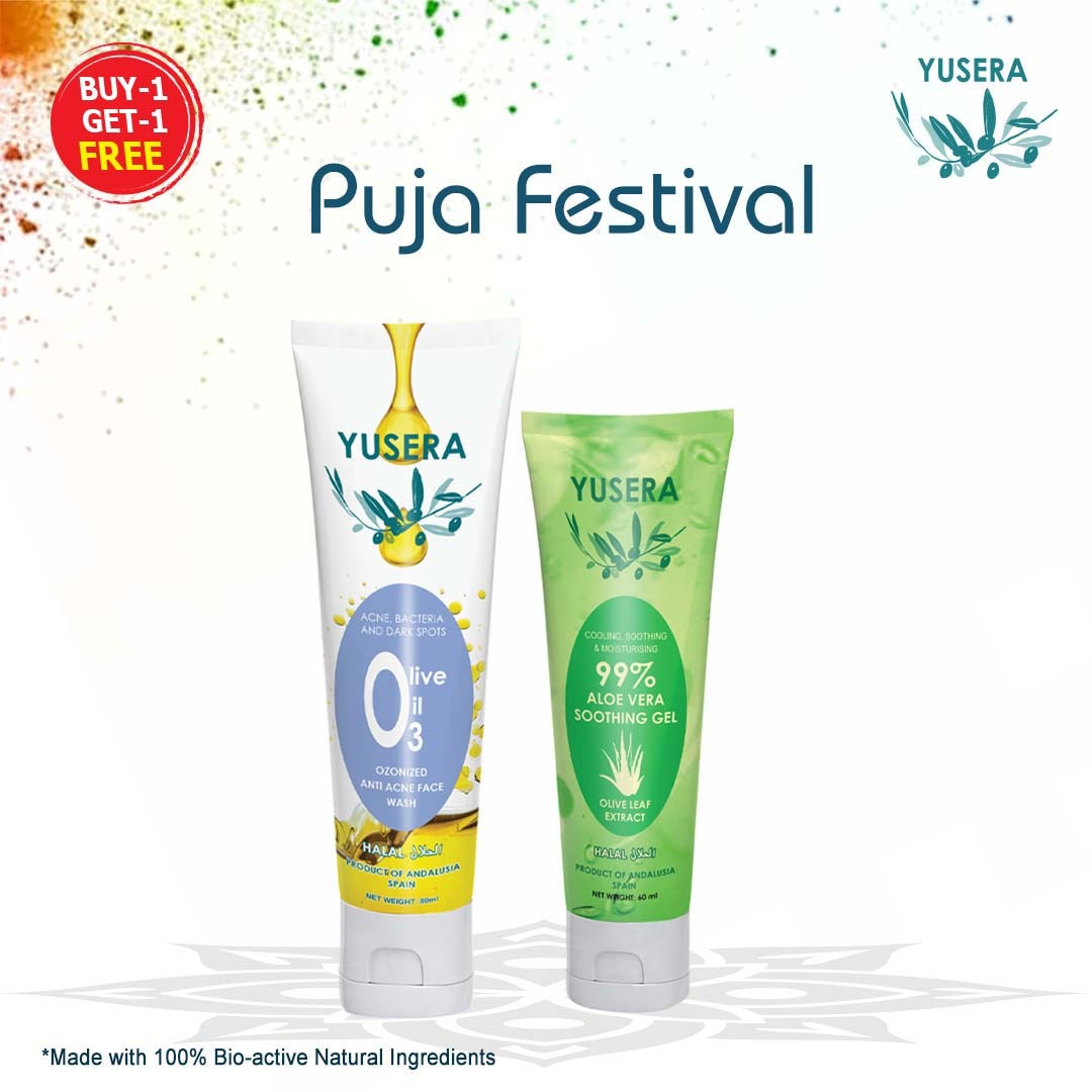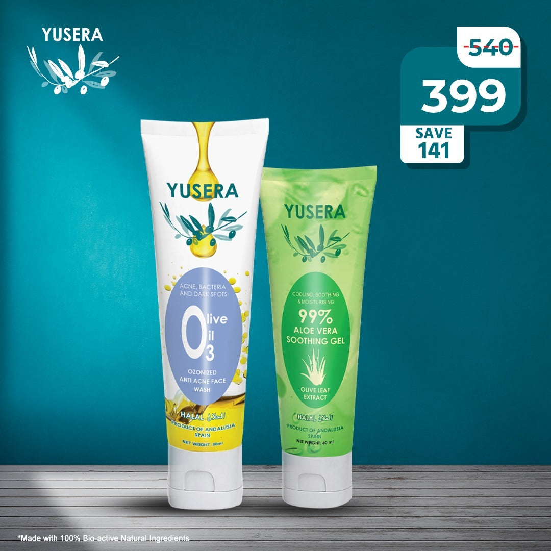 Start with the Yusera Ozonized Anti Acne Face Wash, enriched with ozonized olive oil, to deeply cleanse pores, fight acne-causing bacteria, and reduce dark spots without stripping your skin’s natural moisture. Follow with the Yusera 99% Aloe Vera Soothing Gel, packed with pure aloe vera and olive leaf extract, to instantly calm irritation, restore hydration, and leave your skin feeling soft and refreshed.