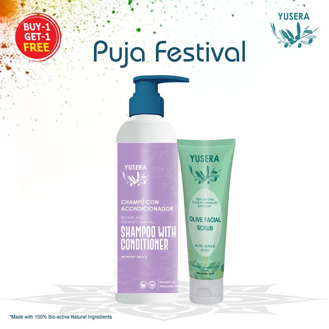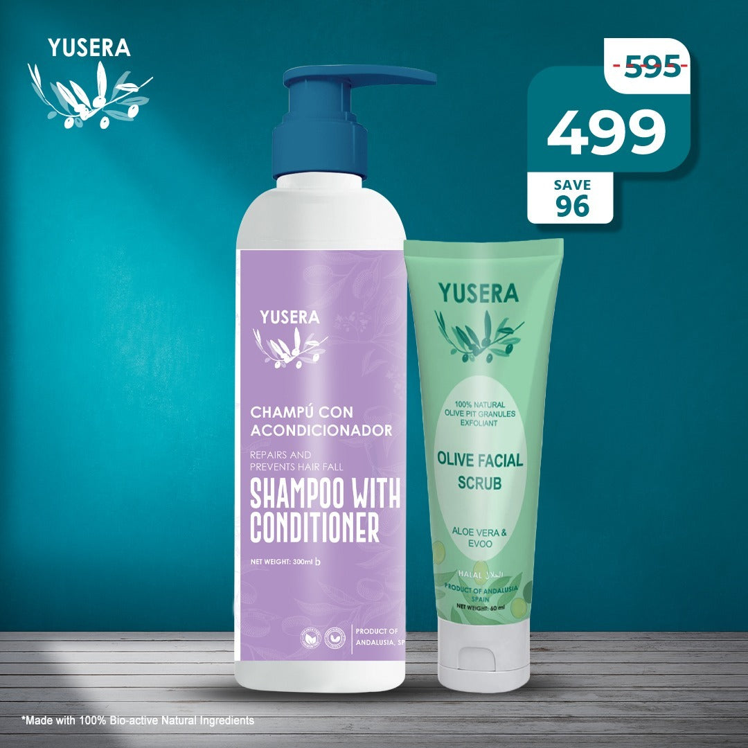 Yusera Hair & Skin Revival Combo – Shampoo with Conditioner 300ml + Olive Facial Scrub 60ml