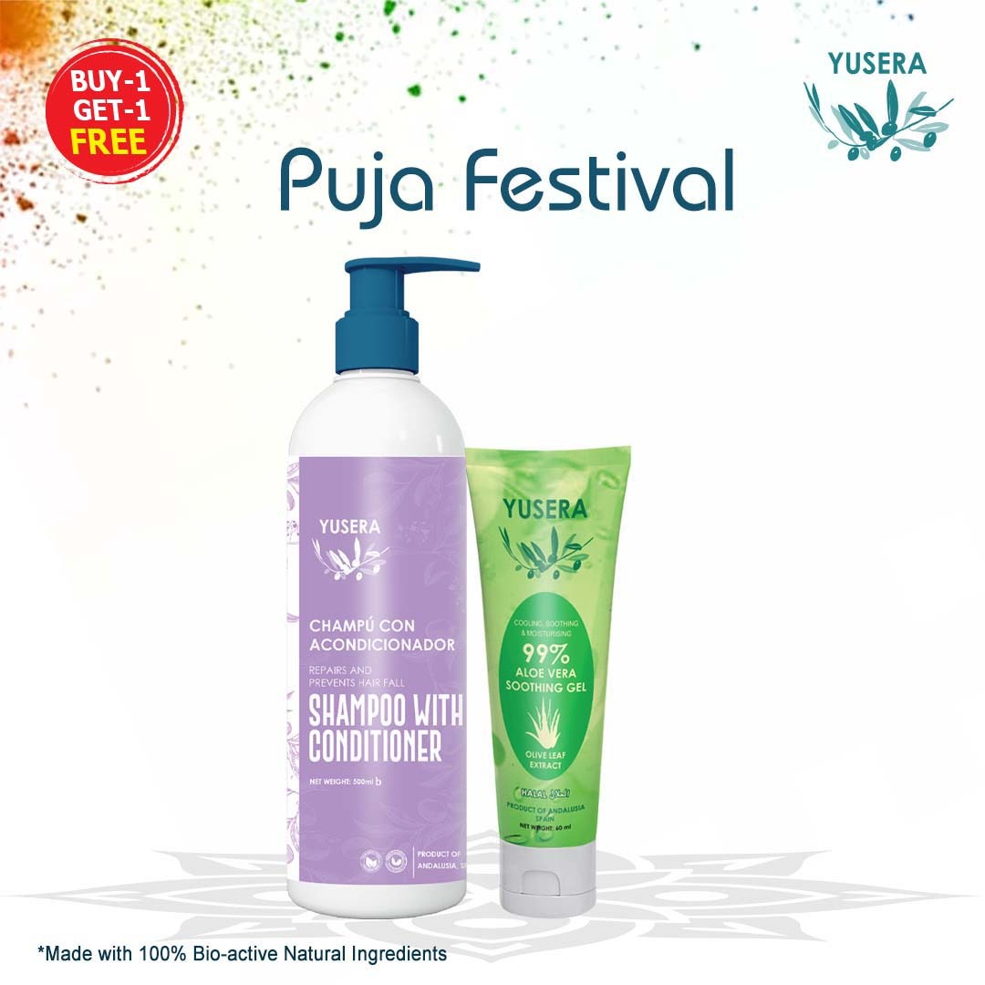 Yusera Hair & Skin Nourish Combo – Shampoo With Conditioner 500ml + 99% Aloe Vera Soothing Gel 60ml