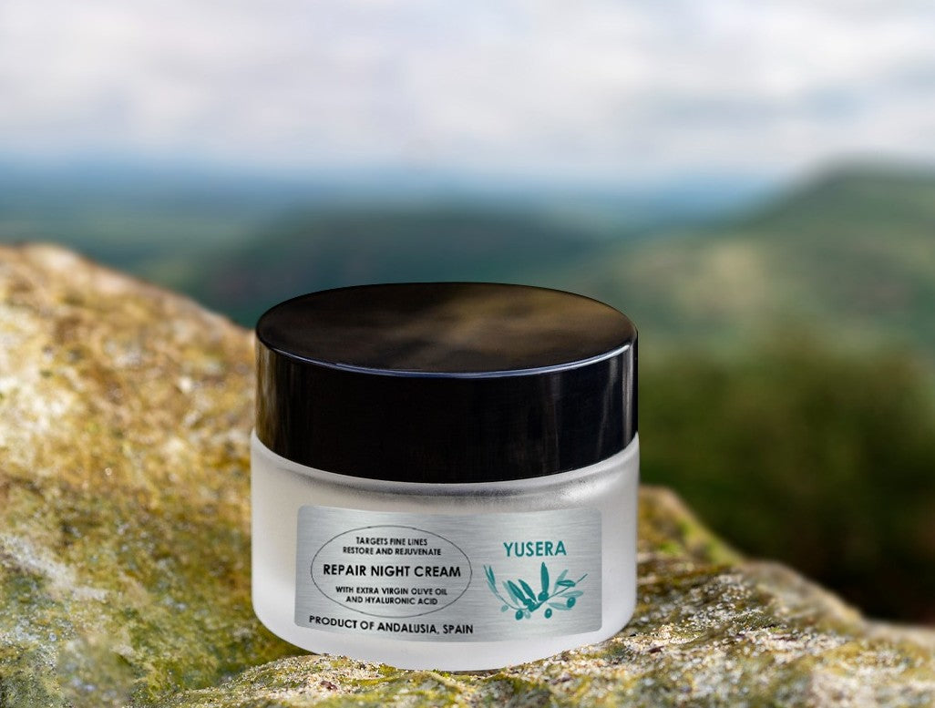 Let your skin heal while you sleep. Experience overnight transformation with Yusera Repair Night Cream, powered by 100% natural ingredients from Spain. Infused with extra virgin olive oil and Hyaluronic Acid extract, this lightweight cream works while you sleep — Repairing, Nourishing, and Reviving your skin.